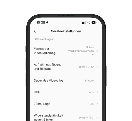 Die A810 lässt sich über das WLAN der Dashcam mit der 70mai-App verbinden und ermöglicht Ihnen den Zugriff auf Echtzeitaufnahmen, das Erstellen von Fotos, das Herunterladen von Fotos/Videos auf Ihr Telefon oder das direkte Teilen in sozialen Medien. Sie können außerdem Einstellungen wie Auflösungsgrad, Aufnahmedauer, G-Sensor-Empfindlichkeit usw. anpassen.